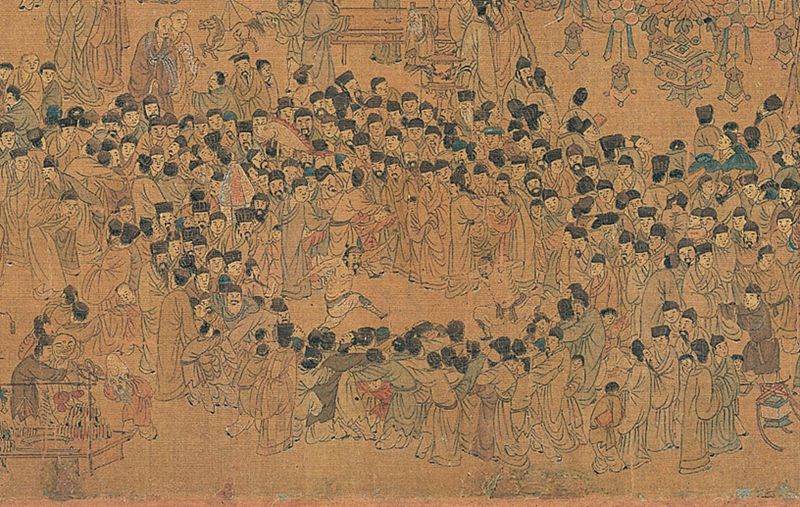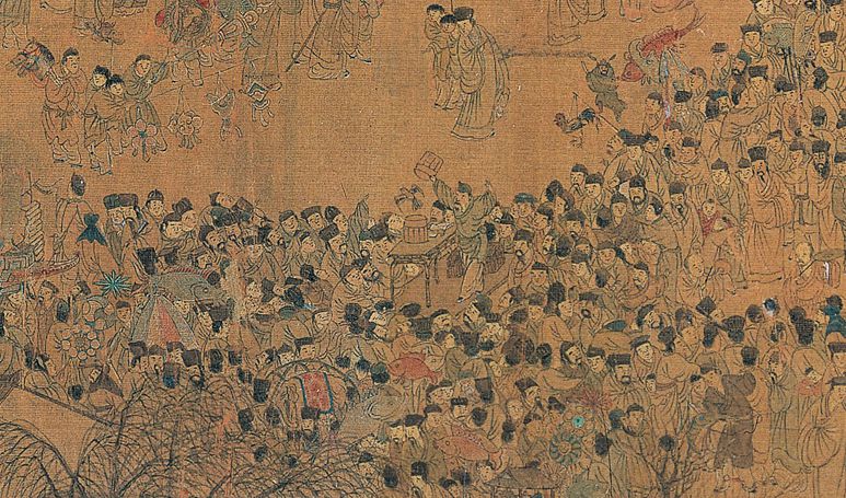 画卷左侧以三孔石桥为地理坐标,经学者杨新考据,此乃南京城南地标内桥,桥北为明代吴王府旧址。桥面摩肩接踵,百姓扶老携幼提灯过桥,代表着“走百病”的古俗——元宵夜妇女着盛装逢桥必过,祈愿祛除病灾。