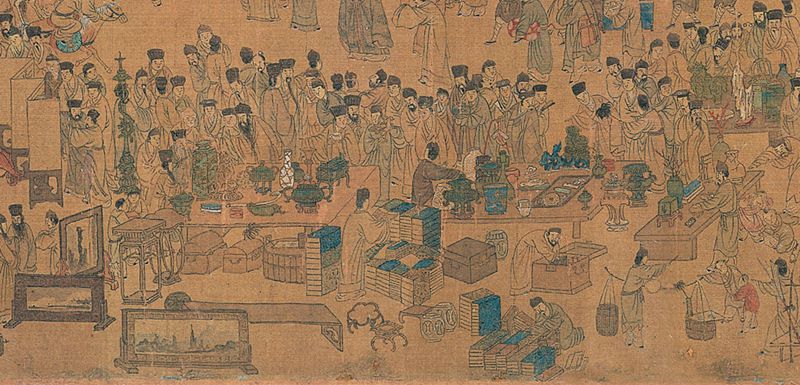 画卷右侧展现的是东市景象,此处多为花鸟盆景、珍禽异兽。不同于西市的喧闹,东市更显文人雅趣。南京夫子庙门口自古就是古董市场,画面中集中描绘了中国文人的生活状态:有画廊展示字画,有说书人讲述故事,更有文人雅士赏玩紫檀家具、雨花石、盆景等雅物。养水仙花、买假山石、养金鱼、养梅花、养兰花……尽显明代文人的生活情趣。
