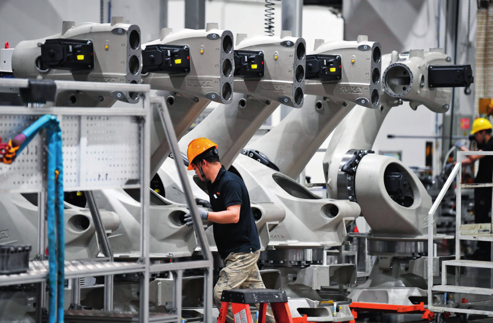 在广东佛山市美的库卡智能制造科技园拍摄的工业机器人产线车间(2025年3月25日摄)。邓华摄/本刊