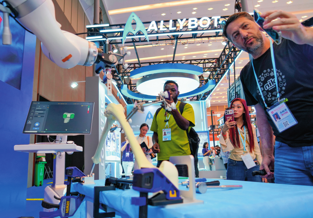 海外采购商在第138届广交会元化智能科技(深圳)有限公司展台观看手术机器人产品(2025年10月19日摄)。肖恩楠摄/本刊
