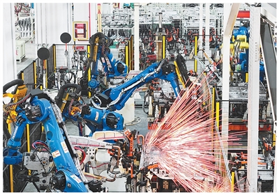 江苏扬州,汽车配件制造企业的工业机器人进行作业。