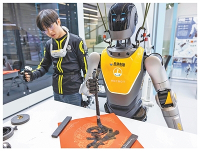 湖北武汉,人形机器人跟着训练师练习写字。
