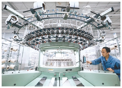 山东青岛,纺织服装企业的技术工人利用数字化设备生产坯布。