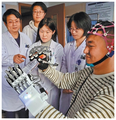 河北秦皇岛,脑机接口科研团队进行脑控机械手系统调试。