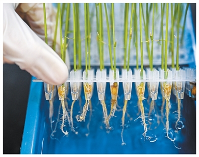 安徽合肥,科研人员观察水稻水培幼苗根系长势。